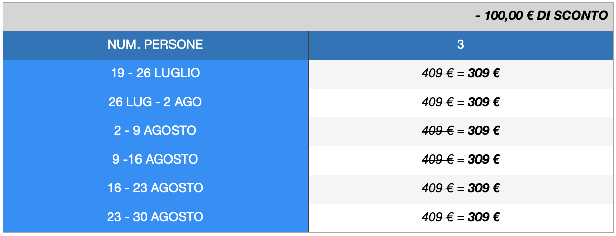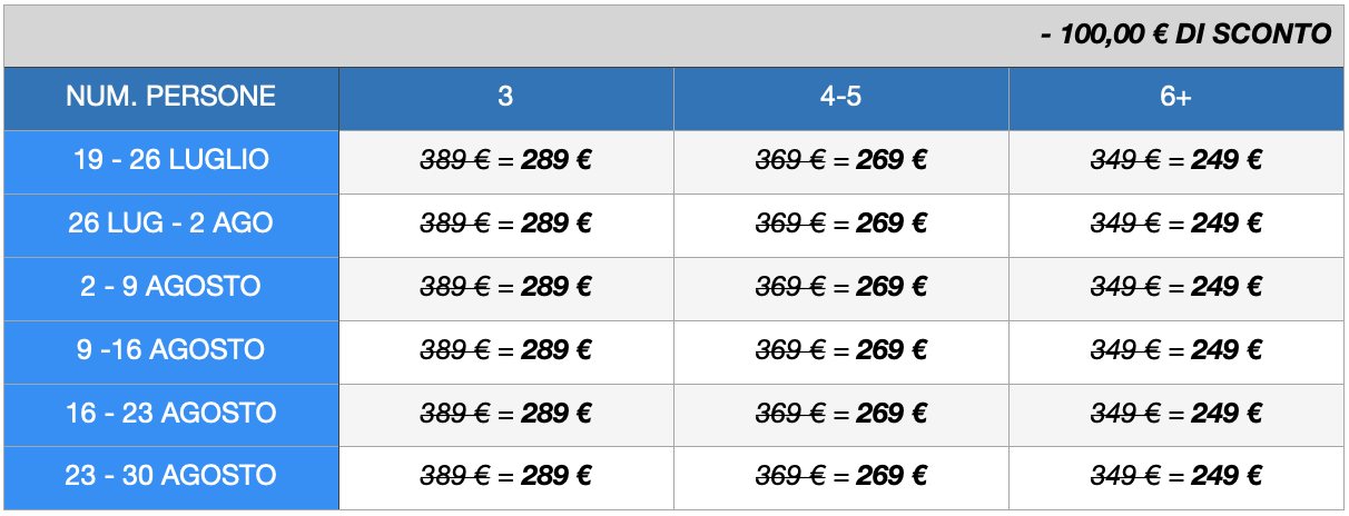 Le quote in tabella non includono 25€ a persona per spese di gestione pratica.